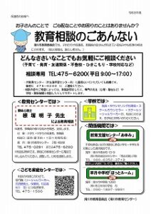 ●教育相談のごあんない ・教育センターでは、子供たちや保護者、教職員の皆さんが抱えている悩みや心配事にのります。 ※詳しい内容につきましては、以下「教育相談のごあんない」PDFをご覧ください。 ・別紙 R8 教育相談のごあんない(PDFデータ)